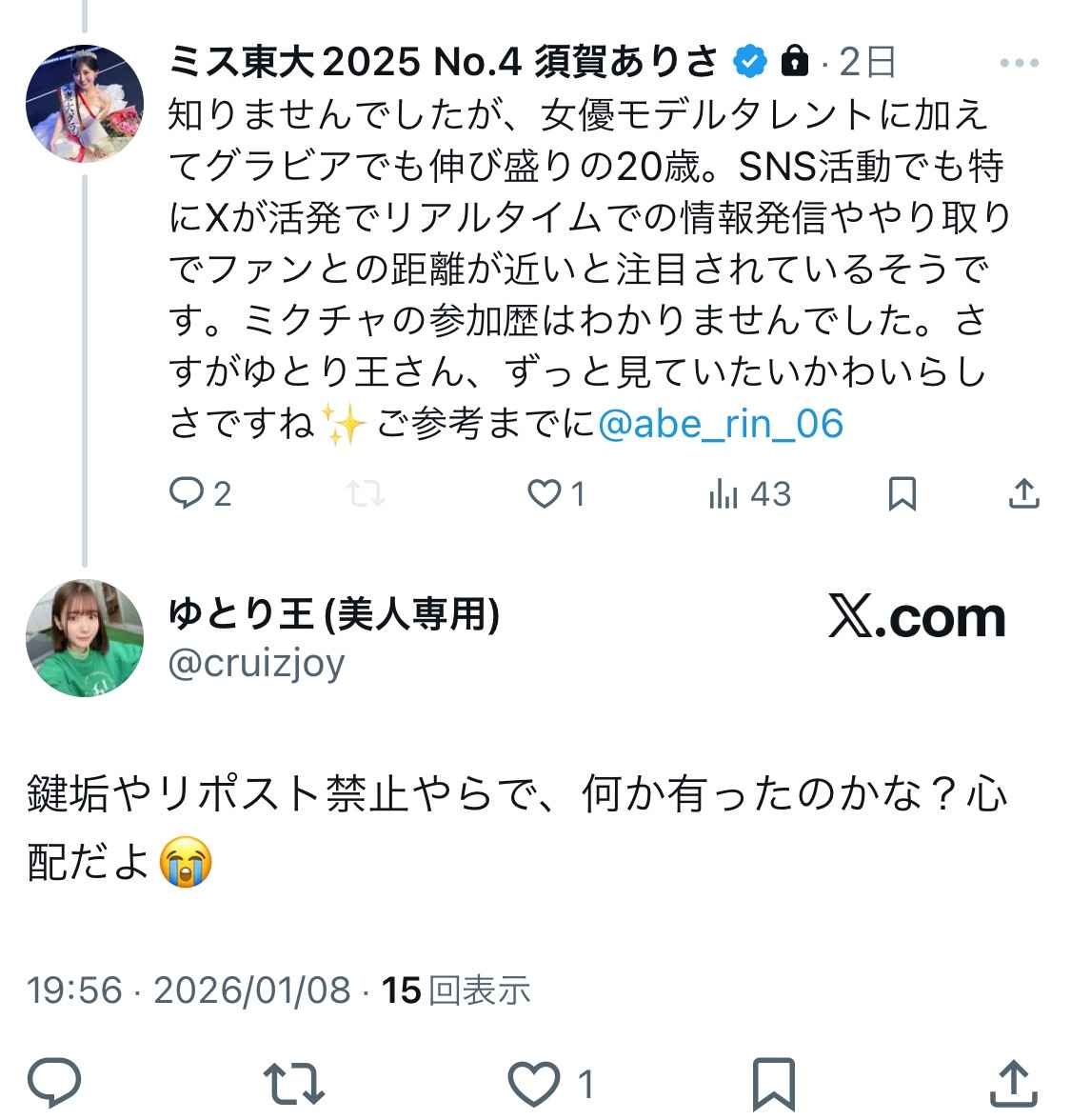 一般的に、ミスコン候補者・著名人は炎上時にプライバシーを守るために鍵垢化やリポスト禁止にするケースが多く、彼女の場合も受賞後(2025年12月頃)の批判の余波で、投稿の拡散を抑え、フォロワー限定の運用に切り替えた可能性が高いです。
