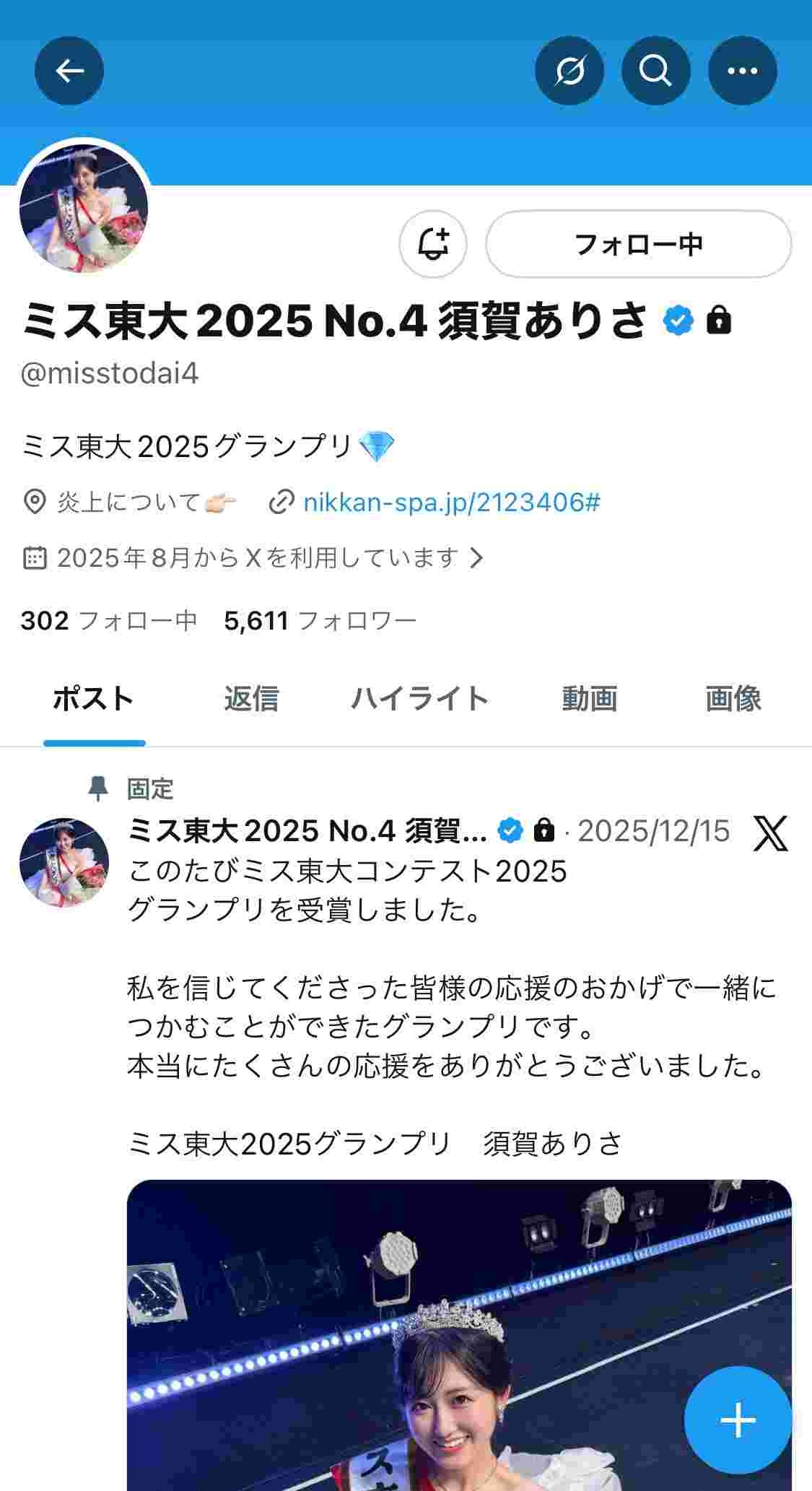 なお、1番の留学生のミス候補者は、準ミスの方にはXでお祝いのリポストしてるけど、須賀のグランプリ受賞だけ完全スルーの模様(笑)