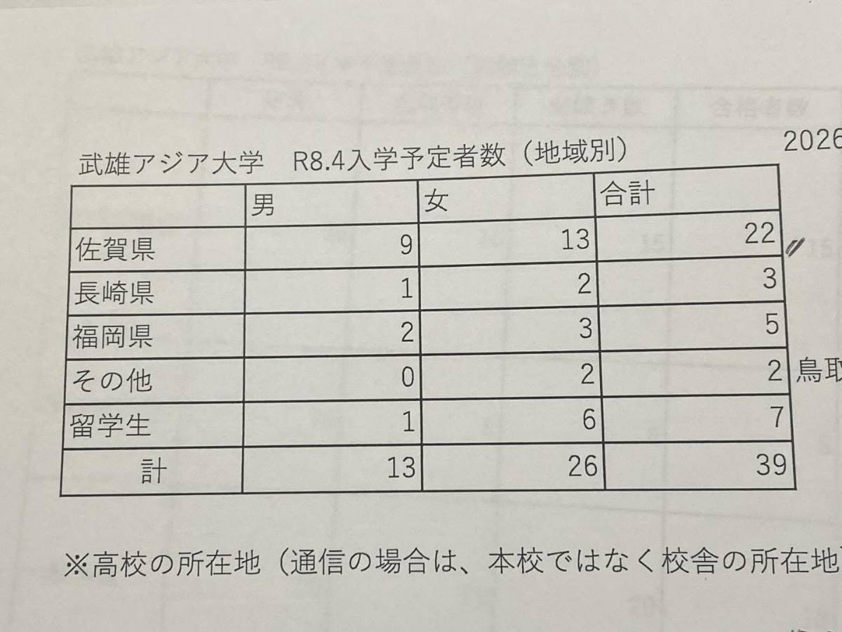 4月に開学する私立大学、武雄アジア大(佐賀県武雄市武雄町)の入学予定者数が定員140人に対し、3割を下回る39人にとどまることがわかった。26日、学長に就任予定の小長谷有紀・国立民族学博物館名誉教授が市議会に対し説明し、「学生募集の取り組みが、まだまだ足りなかったと大いに反省している」と述べた。