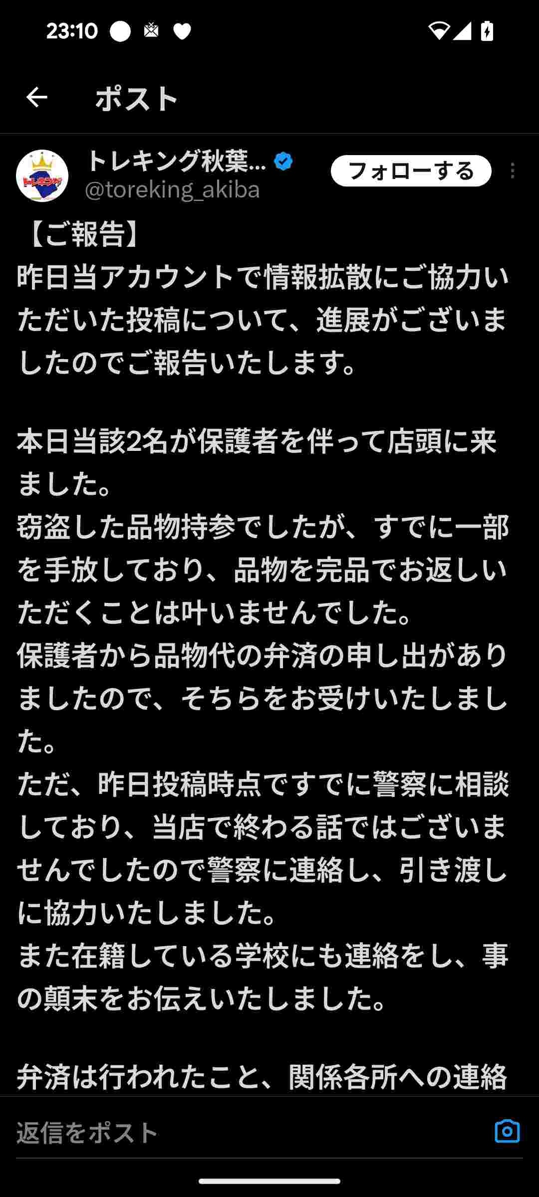 返して欲しいとポストした時点で警察に相談してるし