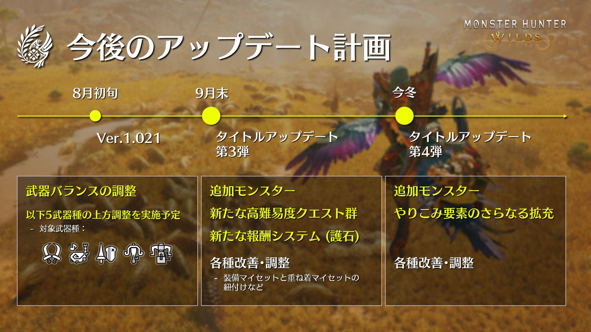 ユーザーの皆様からのフィードバックをもとに、より快適で楽しいゲーム体験をお届けできるよう、引き続き全力で取り組んでまいりますので、今後とも『モンスターハンターワイルズ』を何卒よろしくお願いいたします。