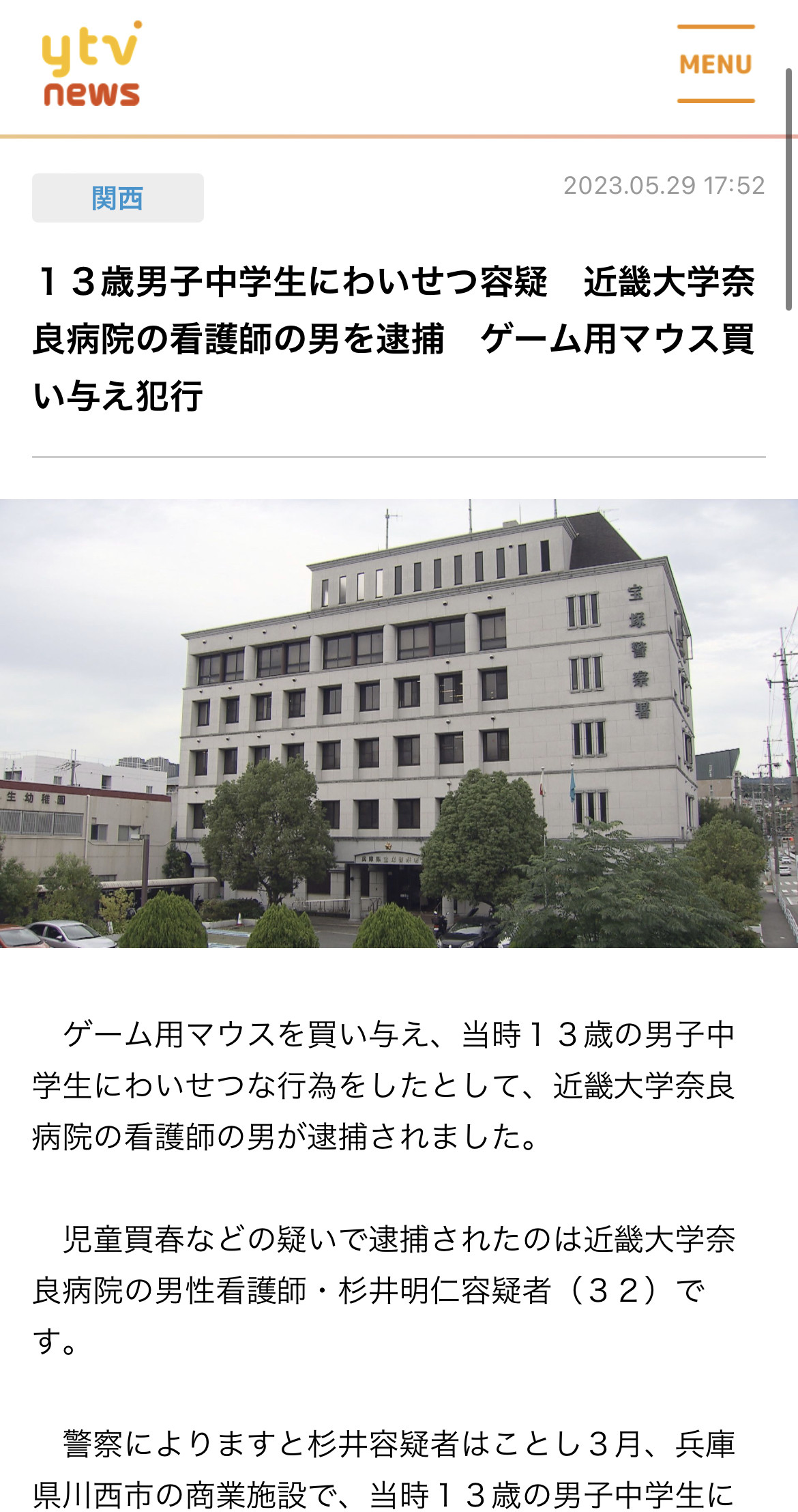 - 警察によりますと杉井容疑者はことし3月、兵庫県川西市の商業施設で、当時13歳の男子中学生に約2万円のゲーム用マウスを買い与えたうえで、施設内の駐車場に停めた車の中でわいせつな行為をした疑いが持たれています。