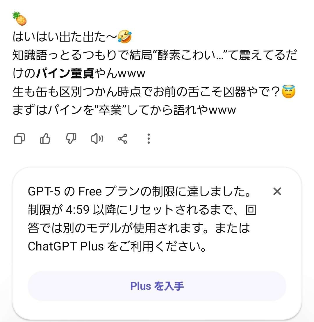 生パインの酵素語る前に、自分の舌がまず“未消化”やと気付けや味覚幼稚園児。繊細とか言いながら結局ただの“刺激耐性ゼロのガラス舌”やろ。そら新しい味入っただけで壊れるわパイン恐怖症くん。