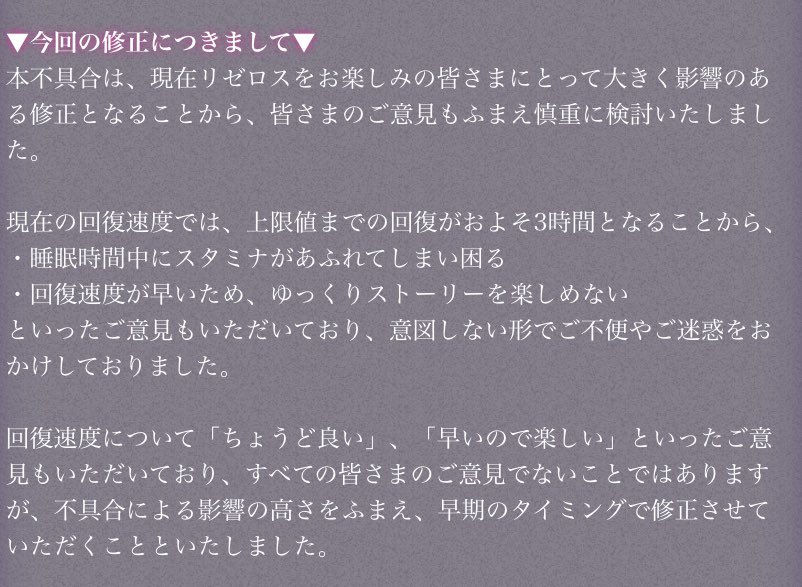 本不具合は、現在リゼロスをお楽しみの皆さまにとって大きく影響のある修正となることから