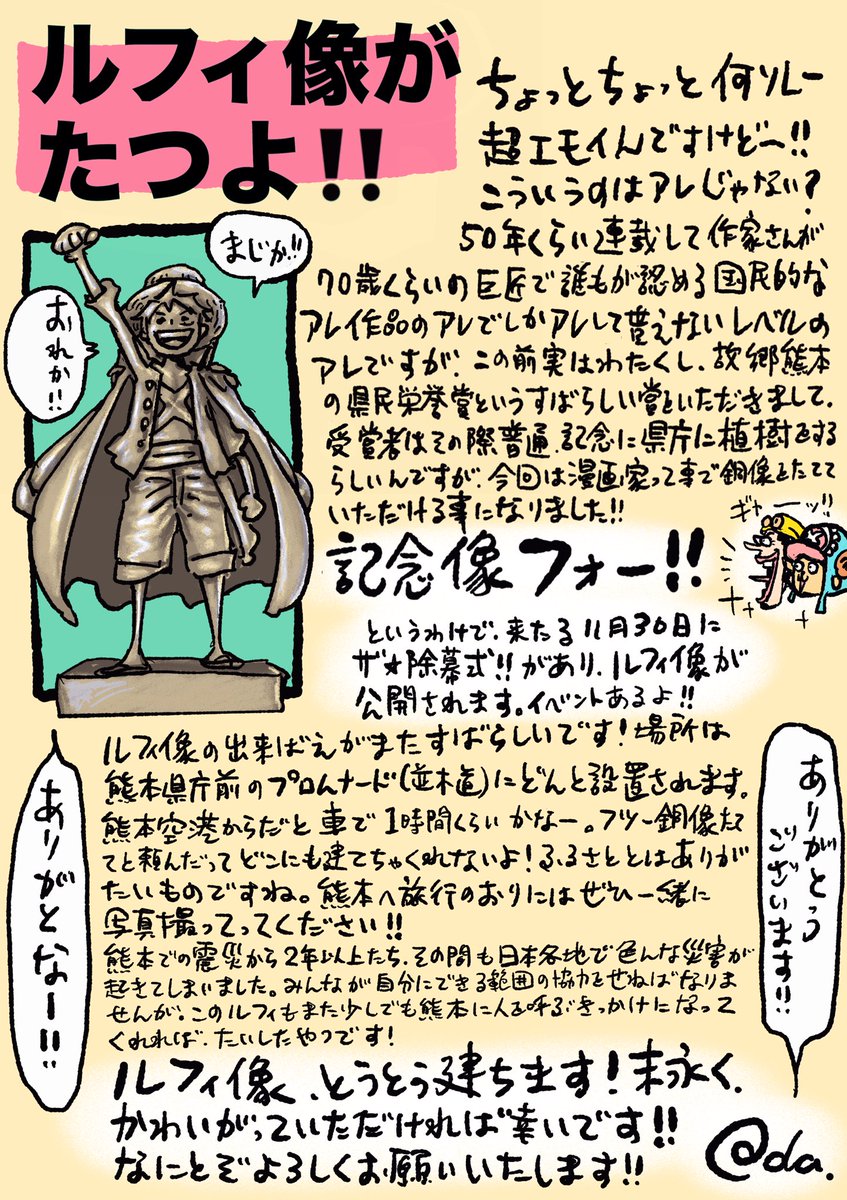 - 尾田くん「銅像がたつって、国民的な巨匠のレベルだよねー!」