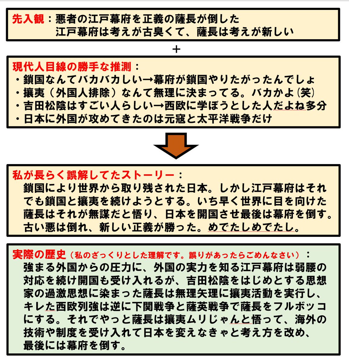- 歴史もので幕末っていつも人気が高いけど、なんか分かりづらいんだよなーと昔から思っていて、その理由は「悪の江戸幕府を正義の薩長が倒した話」と捉えてしまうと全く意味不明になるからだと思う。私は少なくとも高校受験の時点ではこの画像のような誤ったストーリーで理解していました。