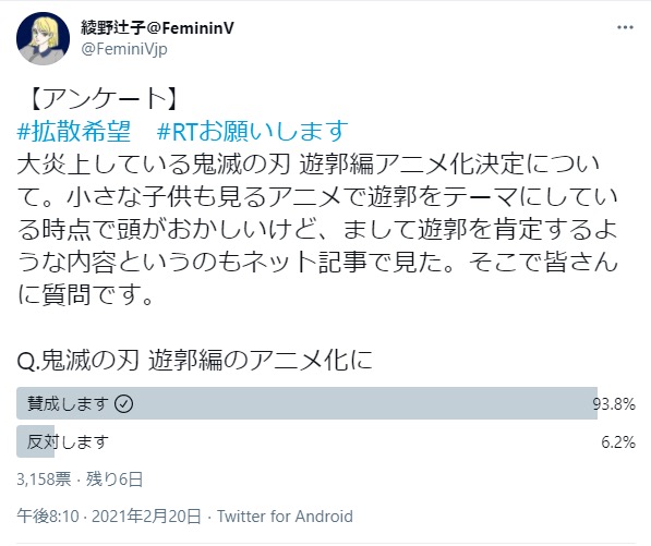 👩🏻「鬼滅遊郭アニメ中止を求めます!アンケにご協力を!原作は未読です!」