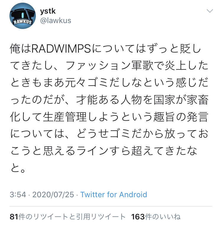 - なんで政府から見捨てられたミュージシャンが国目線で意見しとるんや?