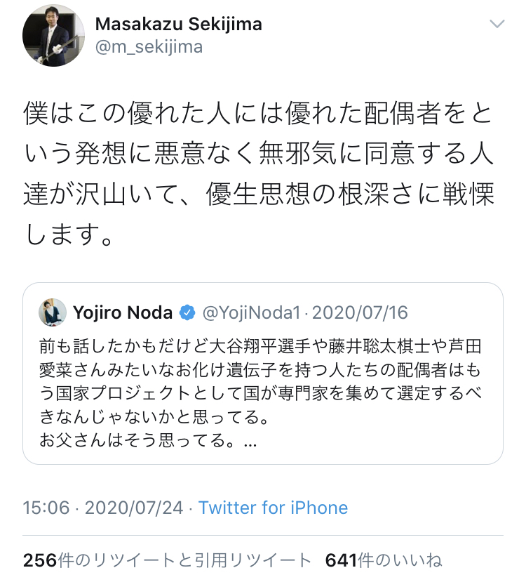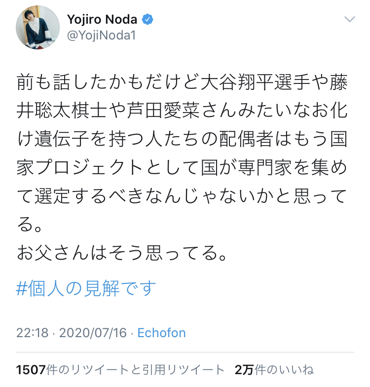 RAD野田「大谷翔平や藤井聡太や芦田愛菜みたいな人たちの配偶者は国が選定すべき」 大炎上