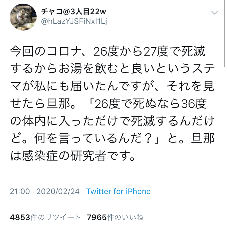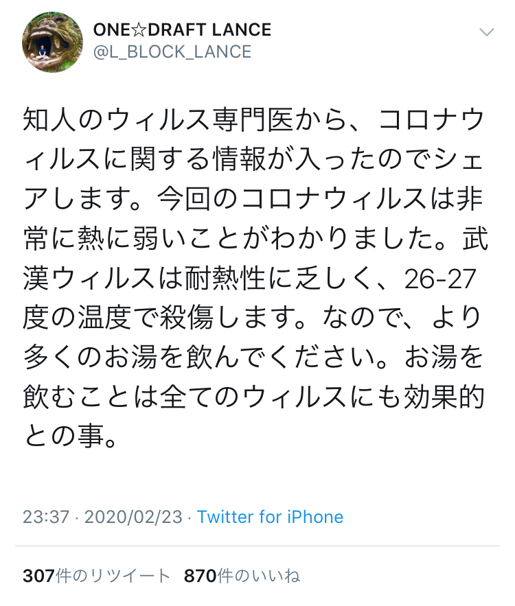 「コロナウイルスは26度のお湯を飲むと死滅する」というデマが大流行。日本人ってここまで馬鹿だったのか…?