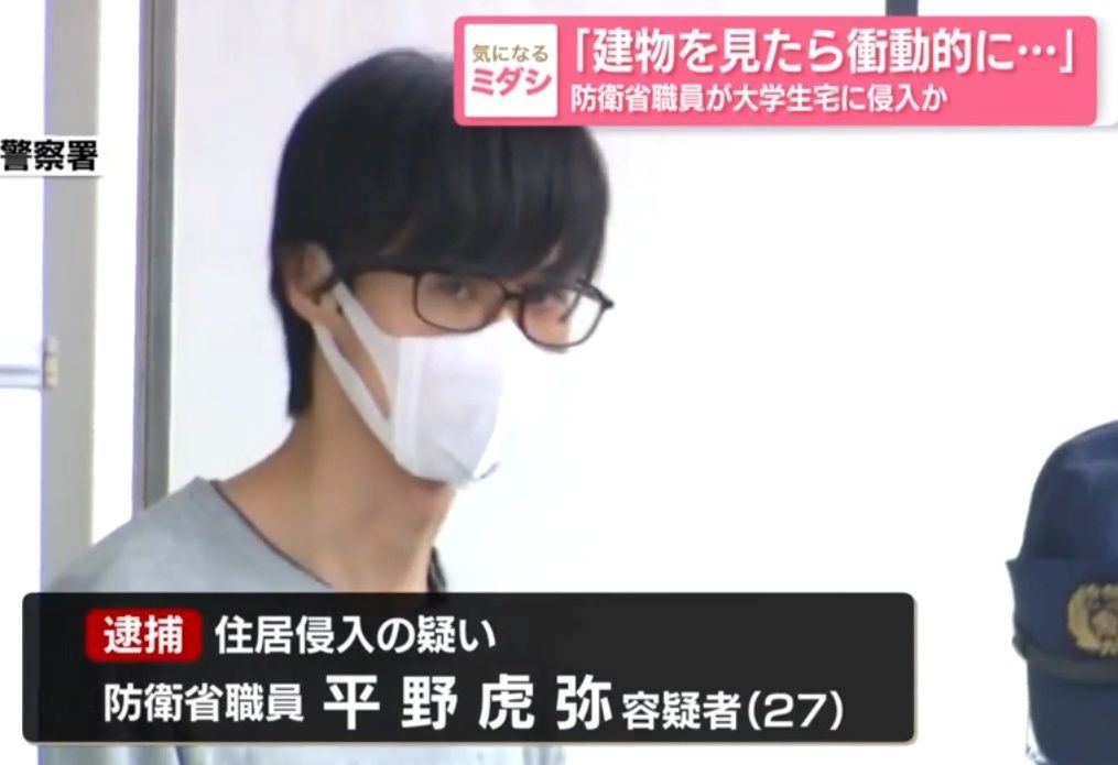 住居侵入の疑いで逮捕された平野虎弥容疑者(27)は、防衛省職員で防衛大学校に勤務していたといいます。