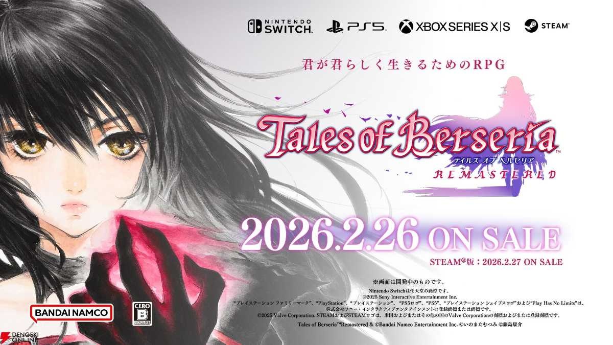 バンダイナムコエンターテインメントは、Nintendo Switch/PS5/Xbox Series X|S/Steam向けに、君が君らしく生きるためのRPG『テイルズ オブ ベルセリア リマスター(TOBR)』を2026年2月26日に発売することを発表しました。