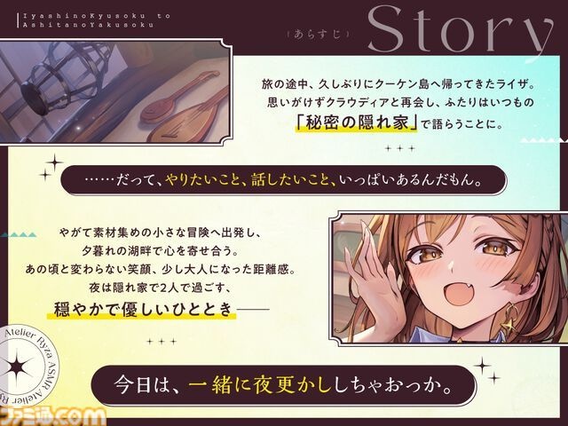 コーエーテクモゲームスは、音声作品『【アトリエシリーズ】ライザのアトリエ ASMR ~癒しの休息と明日の約束~』をDLsiteにて2025年11月20日(木)0時より販売開始した。