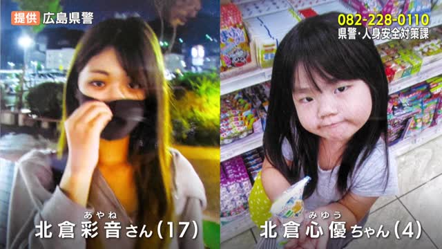 行方不明になっているのは東広島市に住む北倉彩音(きたくら・あやね)さんと、妹の心優(みゆう)ちゃんです。