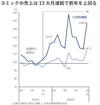 2020年は10月の漫画売上が前年比1.5倍になるなど、13か月連続で前年を超えている。
