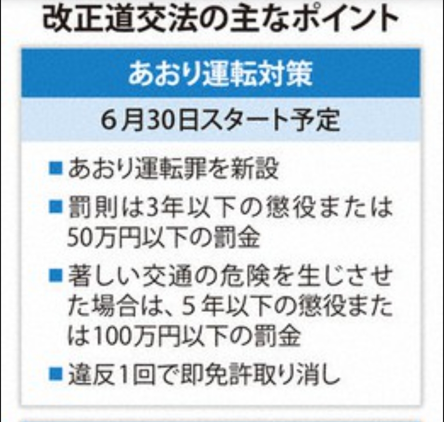 来週中に公布され、6月30日にも施行される見通し。悪質なドライバーが後を絶たないことを重視し、飲酒運転と同程度の罰則を初めて設けた。対象となる行為は、不必要な急ブレーキや車間距離の不保持といった10類型を規定。