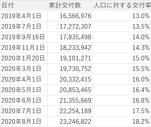現在、マイナンバーカードはどの程度普及しているのだろうか。マイナンバーカードの交付状況は総務省のページで確認できるが、公開されているデータを基に過去1年半分の累計交付数をまとめたのが次の表だ。9月1日時点で「2,420万枚」という発表があったが、現在の人口カバー率は20%に達していない。