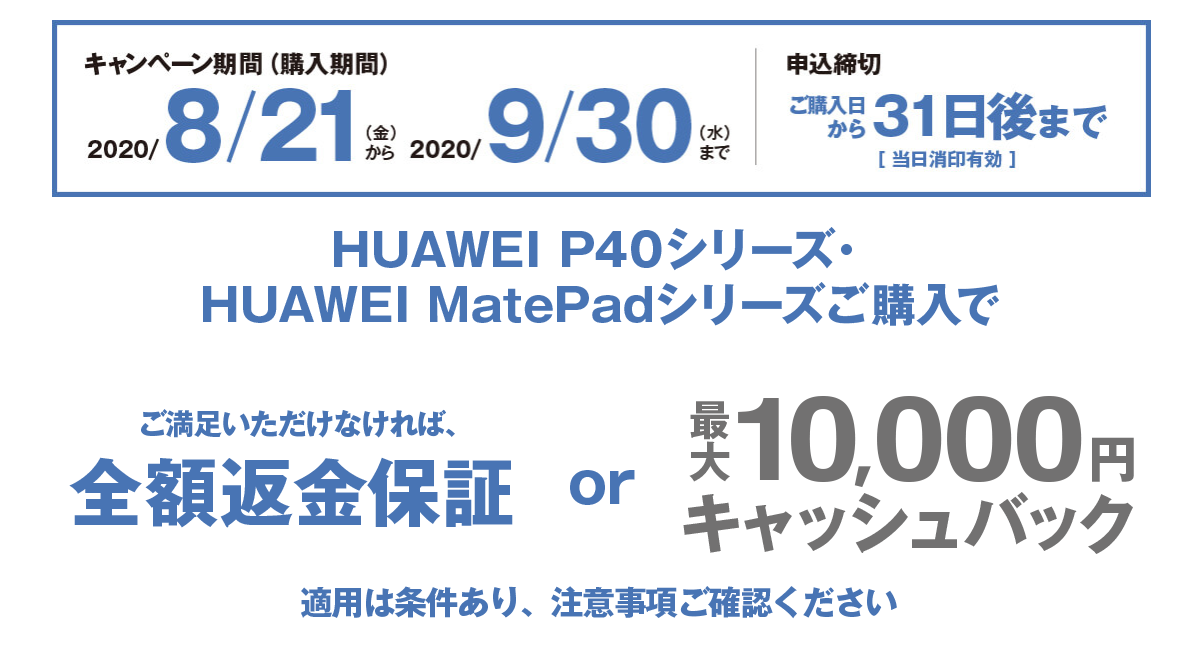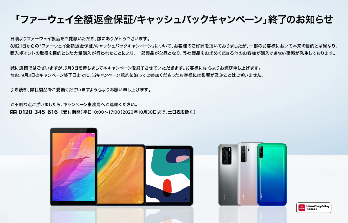 ファーウェイ・ジャパンは、8月21日から実施していたスマートフォン「P40シリーズ」とタブレット「MatePadシリーズ」を対象とした全額返金保証/キャッシュバックキャンペーンを、9月3日をもって終了すると発表した。当初9月30日までの予定だった。
