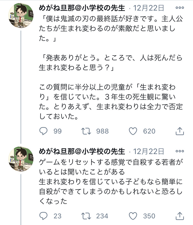 【悲報】小学校教師、ブチギレ「鬼滅のせいで生まれ変わりを信じる子が増えてるから全力で否定しておいた」←鬼滅信者にボコボコにされる