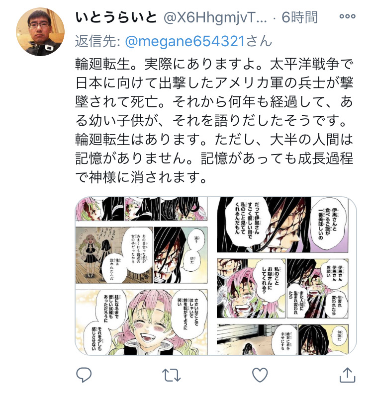 鬼滅信者が創作と現実の区別がつかず輪廻転生を信じてる頭おかしいカルト野郎だってことはよくわかった