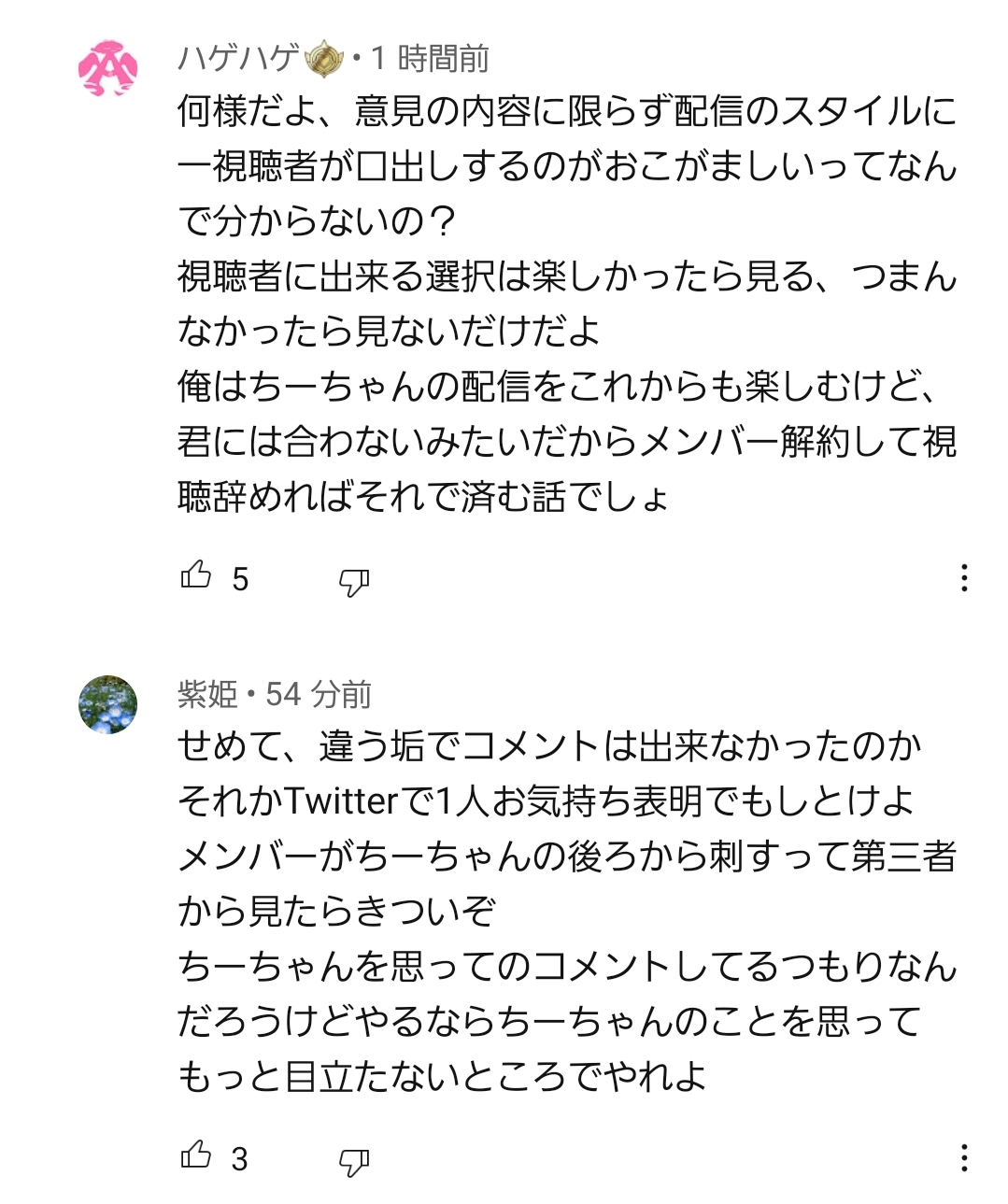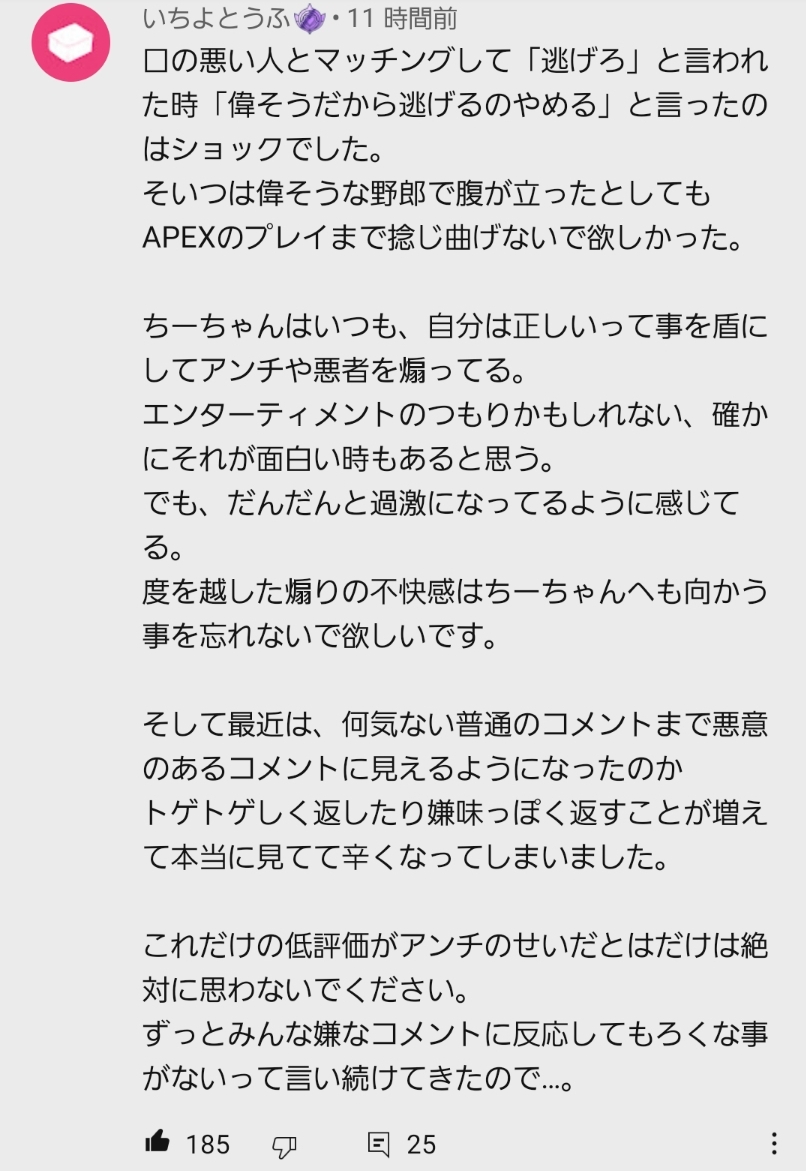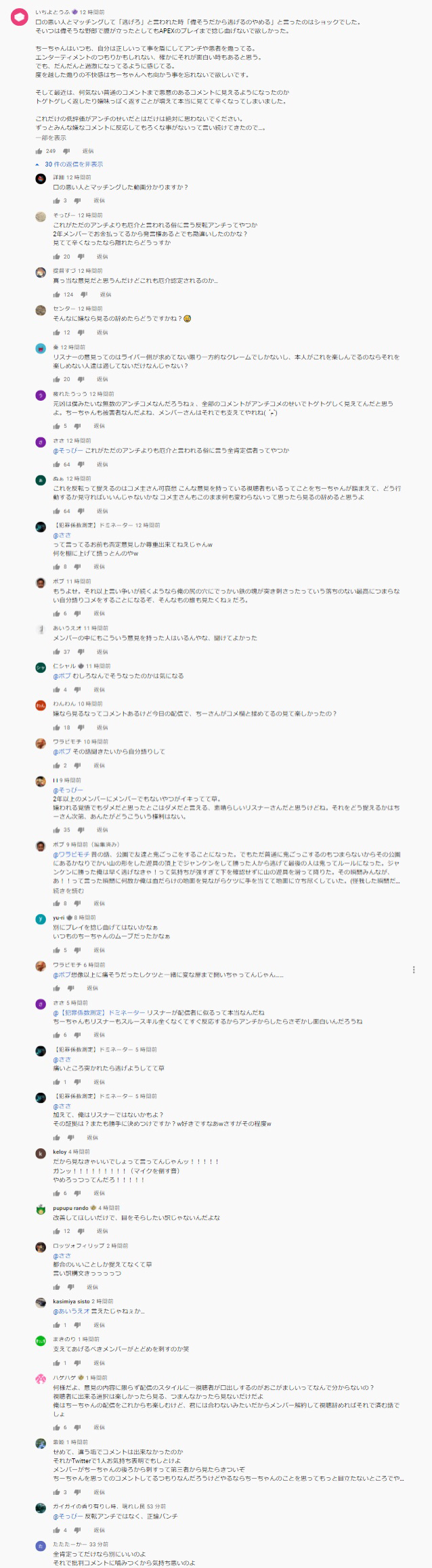 ちーさん昨日お気持ち記者会見 「最近の動画の低評価増加やアーカイブを見直すと「楽しい」と言ったコメントより「不愉快」と言ったコメントが目立つ事態になり冒頭で記者会見を開くことにしました(ネタ風)」