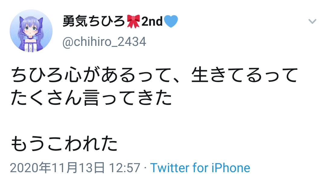 ちーさん「ちひろ心があるって、生きてるってたくさん言ってきた もうこわれた」