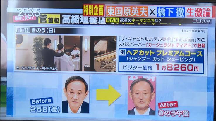 【悲報】菅義偉さん、都内の高級美容室で散髪(18,260円)してしまう………��