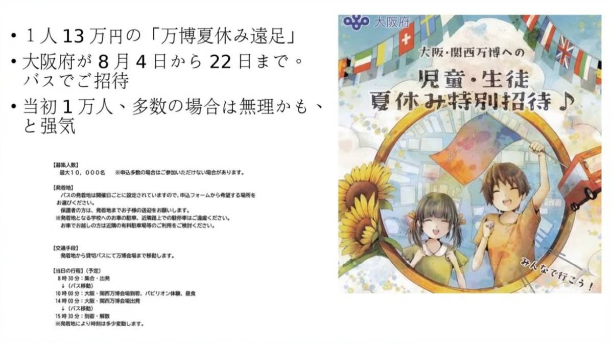 >>1地元で万博開催とか一生に一度もないわけだし、行かせたったらええねんと思うけど