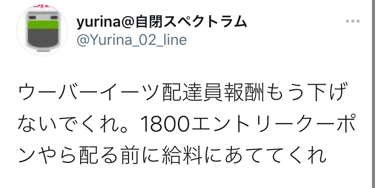 yurina @yurina_02_line : ウーバーイーツ配達員報酬もう下げないでくれ。1800エントリークーポンやら配る前に給料にあててくれ。ふざけんなよ