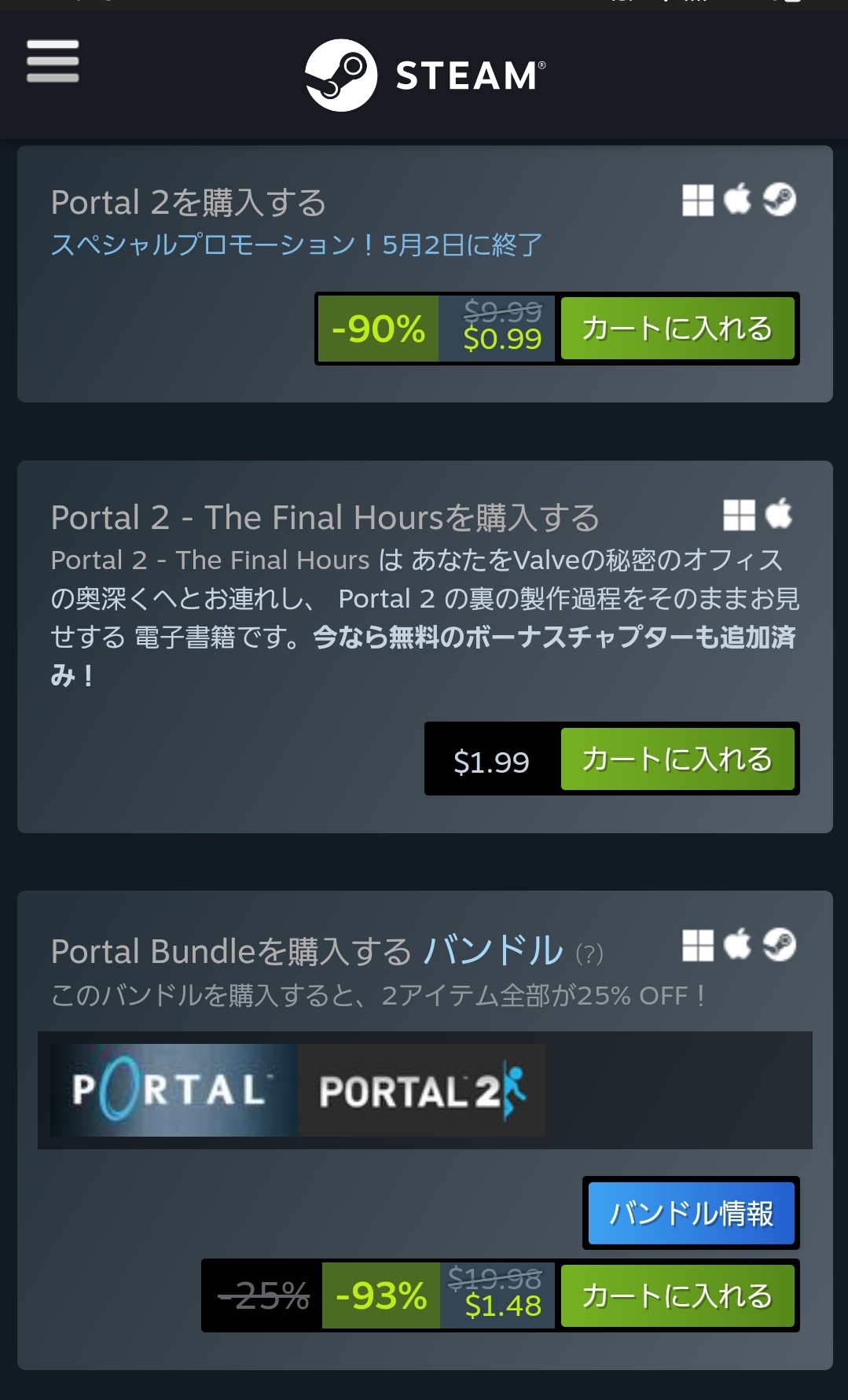 壁や床にポータルを設置し空間を移動することでステージクリアを目指す「Portal」2作をセットにしたバンドル商品が93%オフの180円で販売されている。