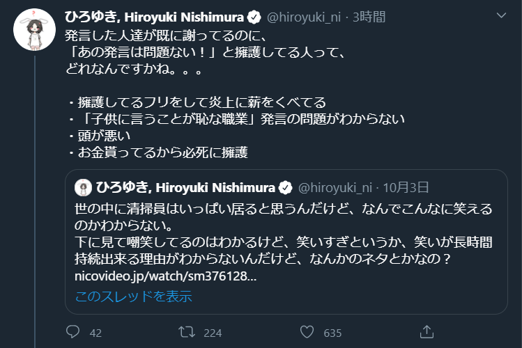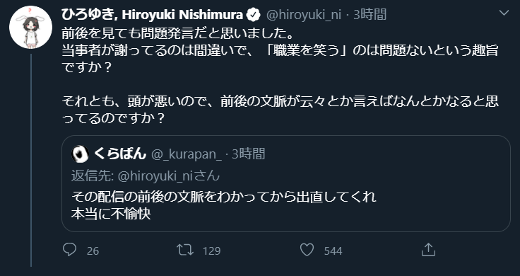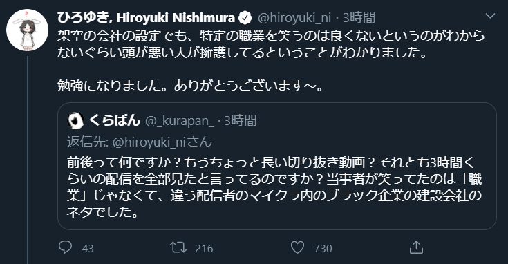 【雑魚狩り王】論破王ひろゆき氏、今度はVTuberの清掃員差別発言は全く悪くないと言い張るフォロワー数7人のカオナシを完全論破!