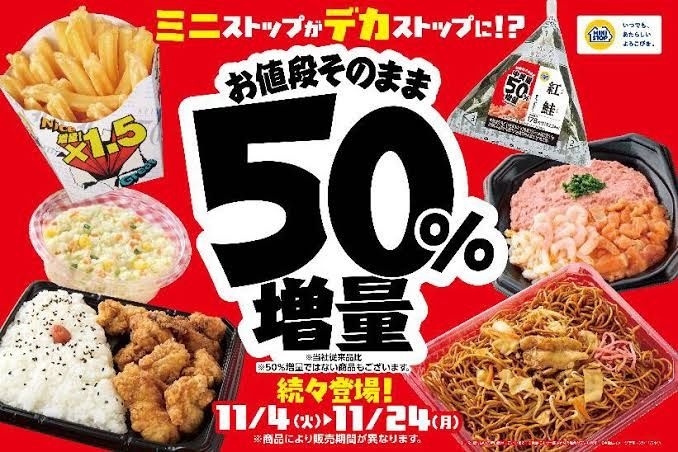 ミニストップは、価格はそのままに総重量や具を増量するフェアを、「ミニストップがデカストップに!?」と題して11月4日より順次開始した。おにぎりや弁当のほか、Xフライドポテト1.5倍、ホットドッグ(ダブルウインナー)などを用意する。増量期間は商品により異なる。