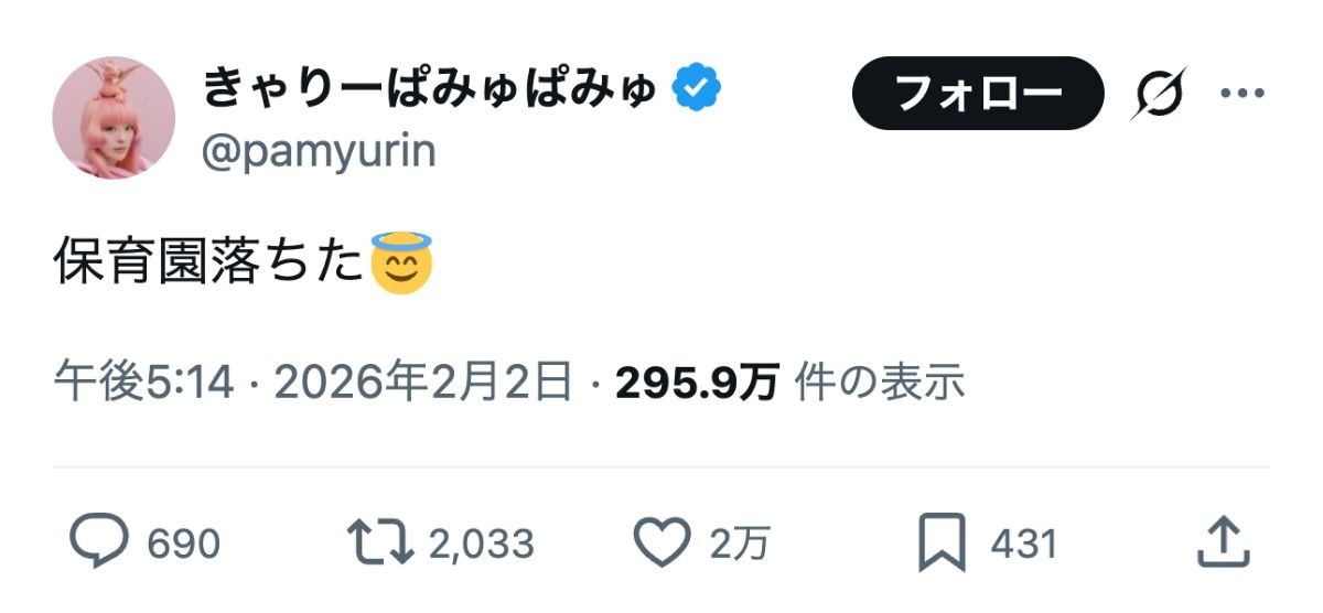 歌手のきゃりーぱみゅぱみゅが2日までに自身のXを更新。保育園の合否通知の報告が投稿から1時間たたずに20万件表示を記録している。