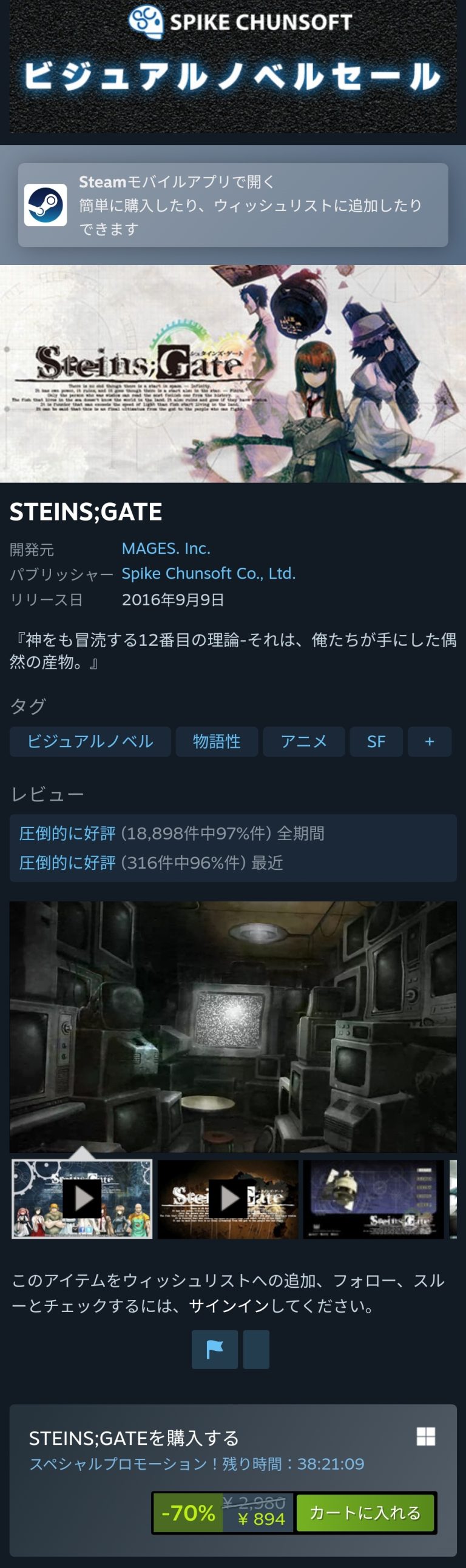 シュタインズ・ゲート、Steamで800円セールwwwwwwwwwwww