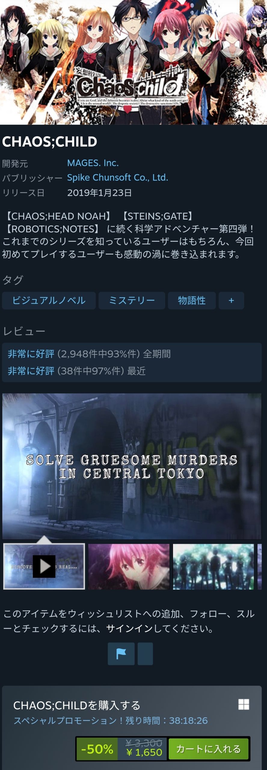 何か月か前のセールのときはシュタゲシリーズ全部80%オフだったのに値上がりしてんじゃん