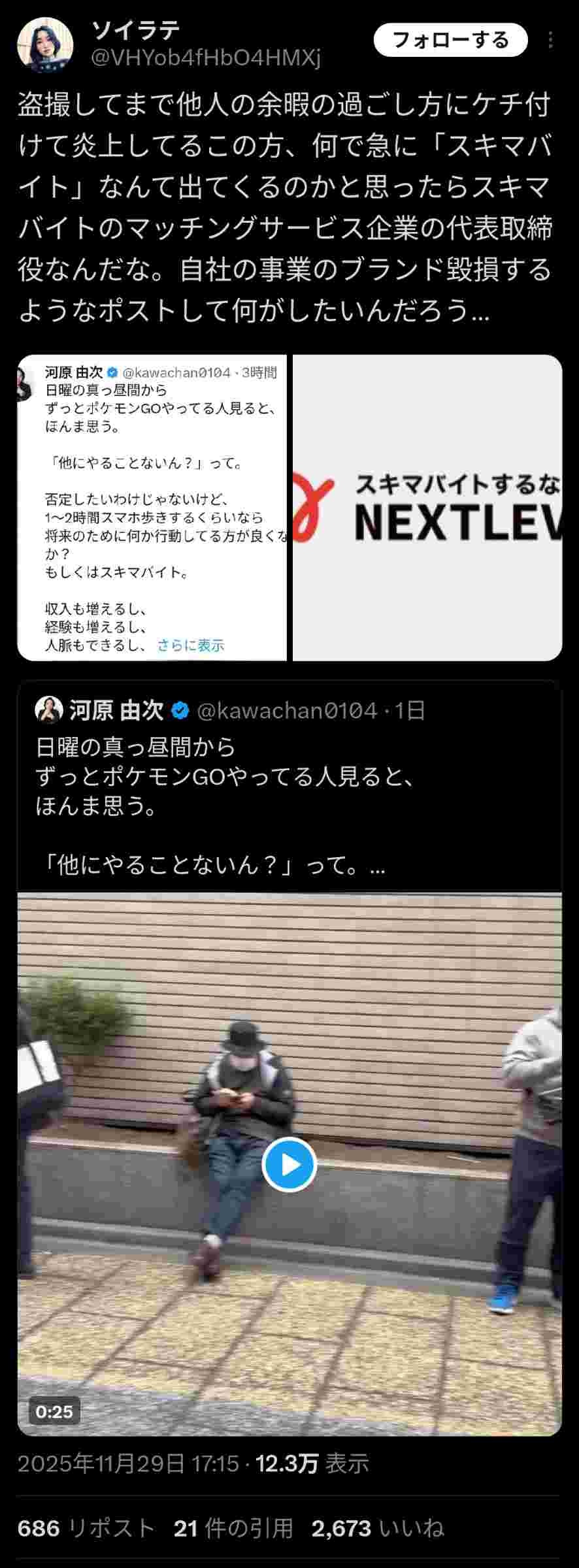 スキマバイト会社社長「日曜の真っ昼間からずっとポケモンGOやってる暇人いたから盗撮したw」→大炎上