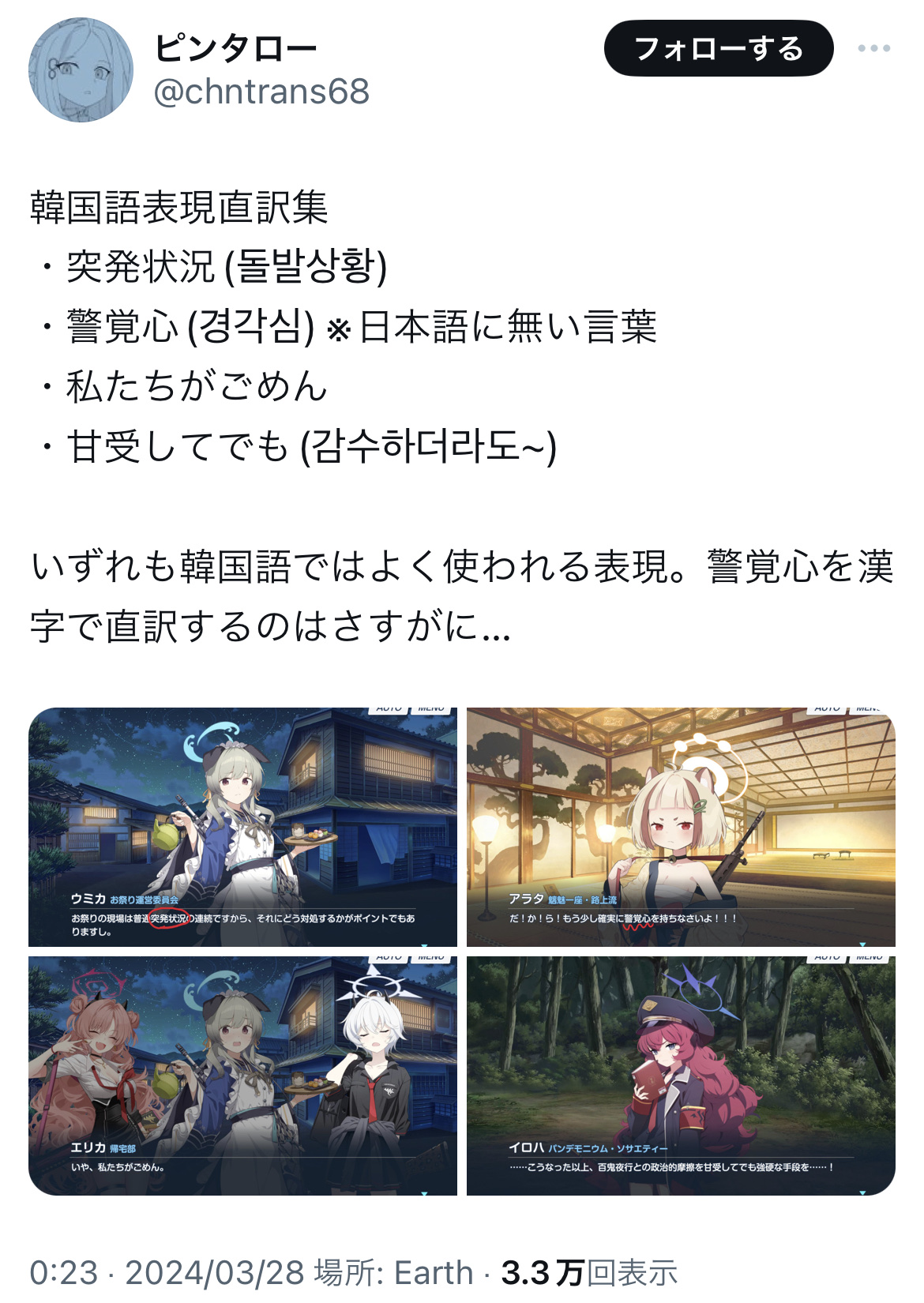 ブルアカのキャラは本来韓国語を喋ってるはずなんだよな…