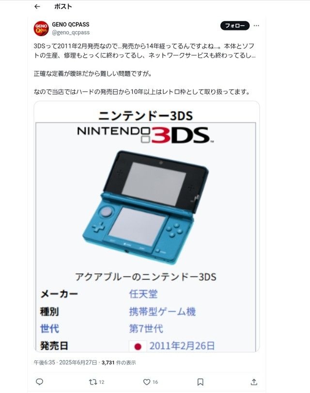 「DSは既にレトロゲーの範疇になったが、3DSはまだレトロゲーを名乗る資格はない 俺の中のレトロゲーの定義は最後のソフトが出て10年以上経過したハードになる」