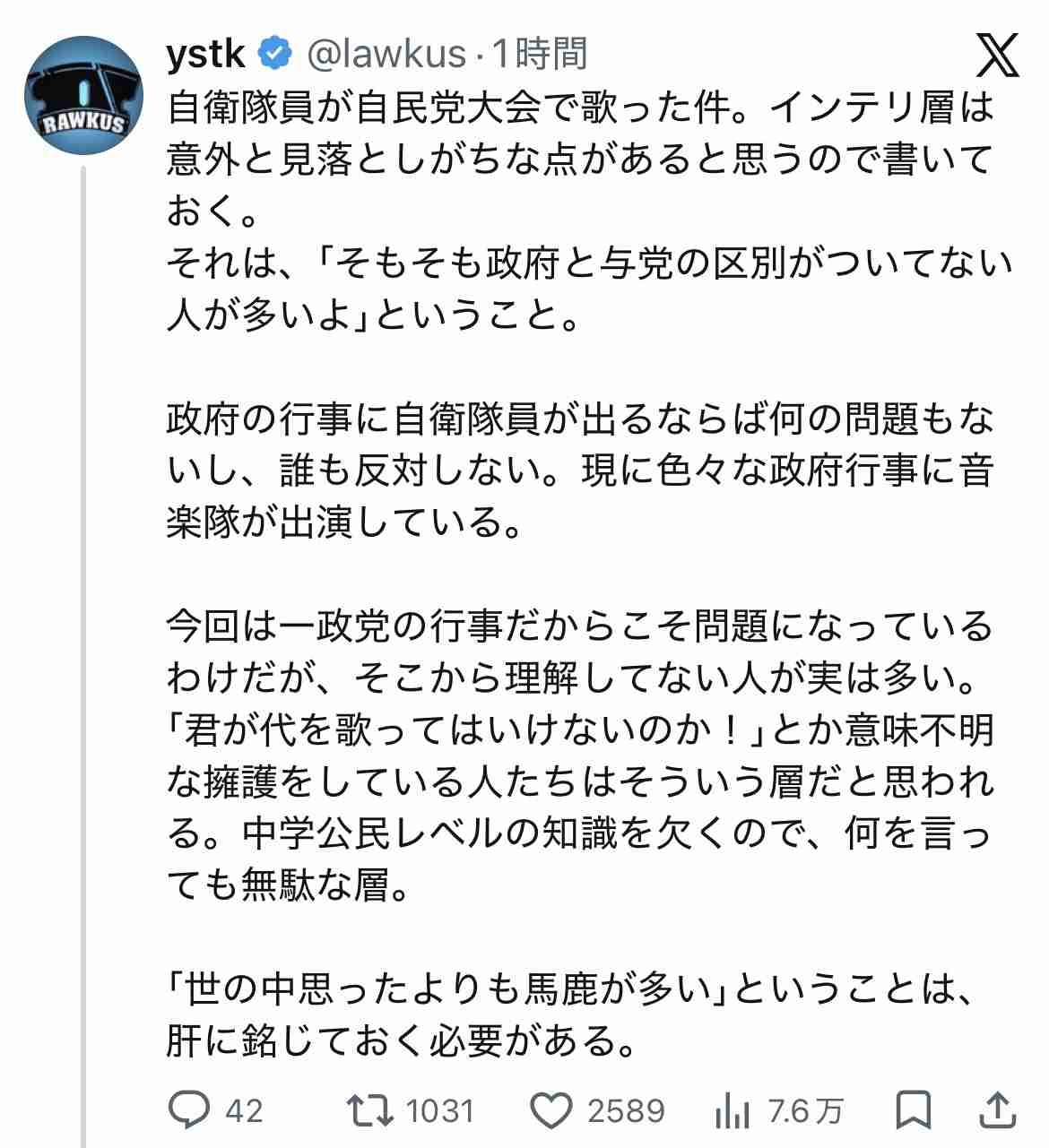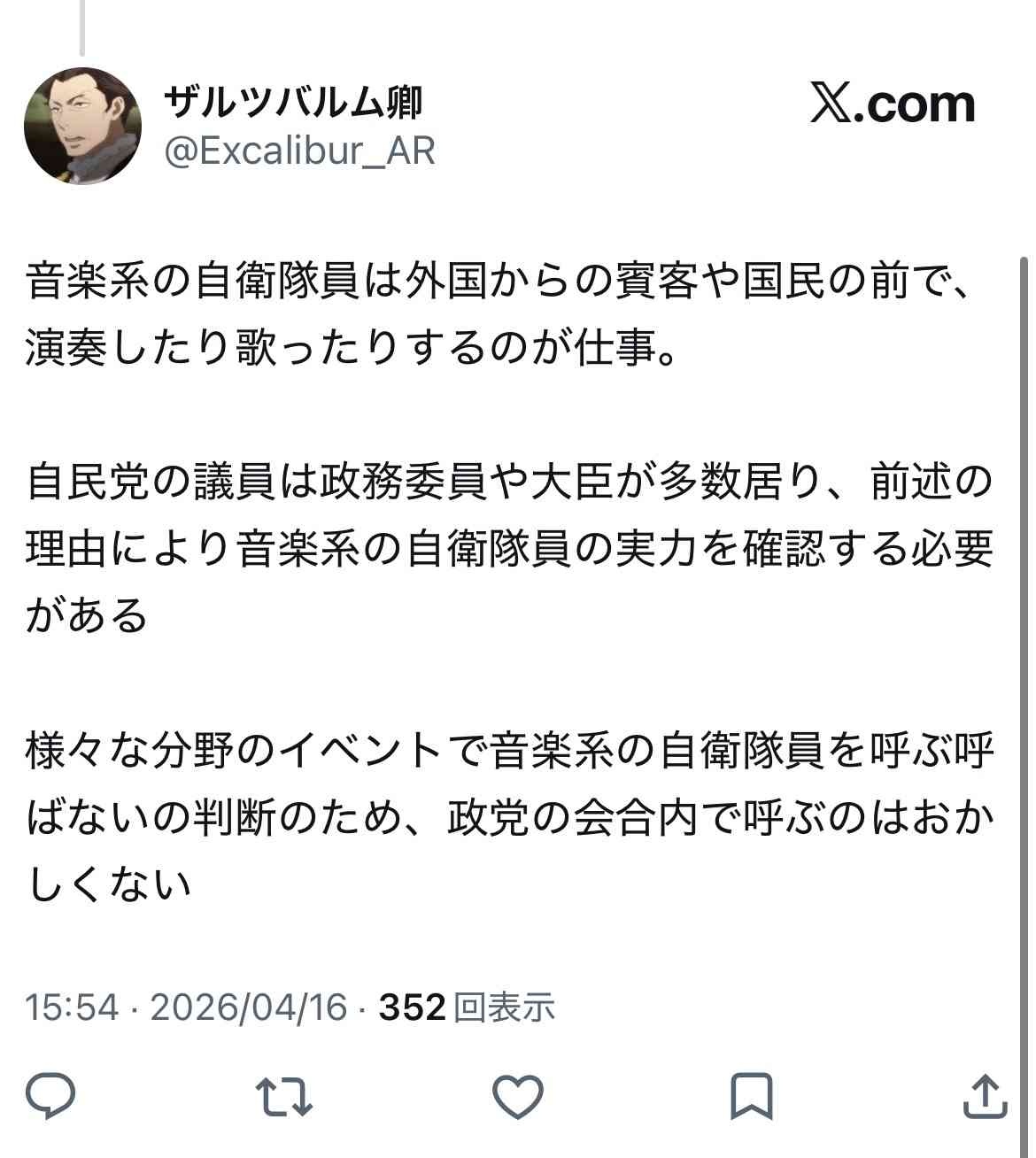 自衛官が国歌歌って何が悪いって論点ずらしてんのが最多数派だな