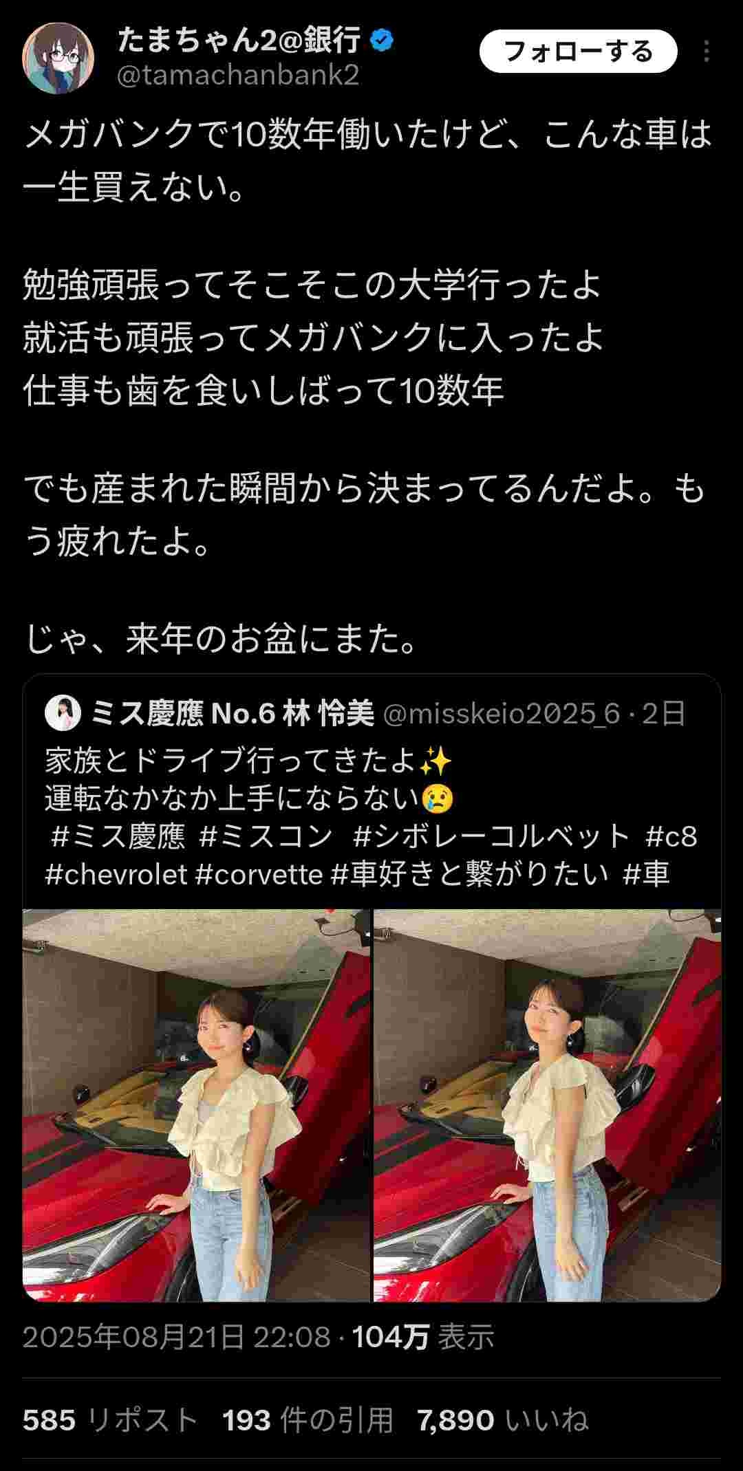 メガバンなら頑張って働けばコルベットなんて買えるとかの話ではなく、頑張って働かなくても親ガチャで学生でもなんだろうが手に入るということだろ。