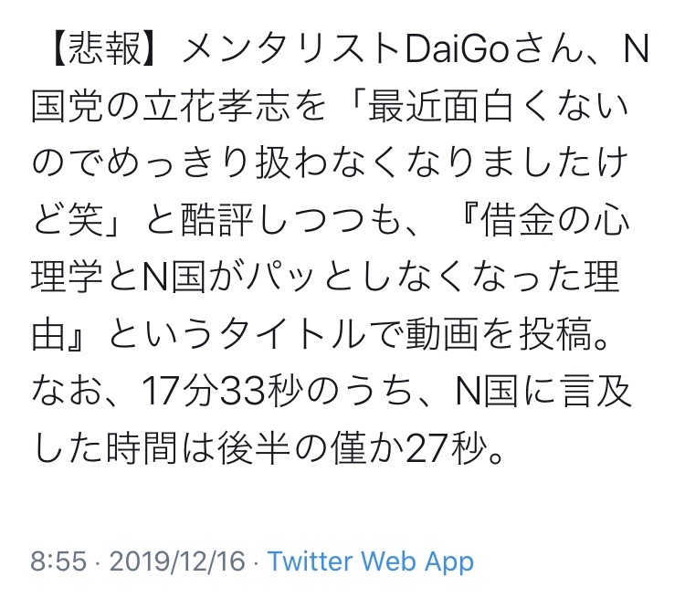 メンタリストDaiGoさん、N国党の立花孝志を「最近面白くないのでめっきり扱わなくなりましたけど笑」と酷評しつつも