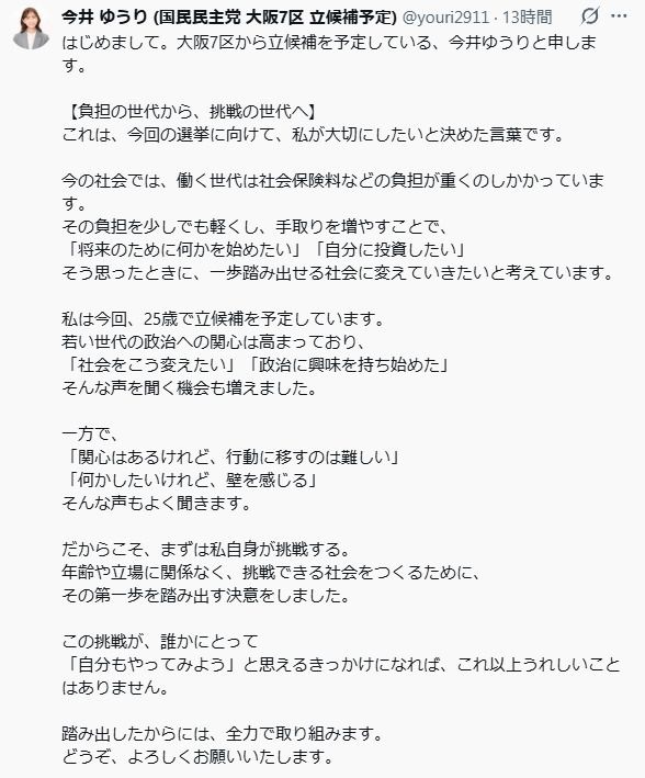 「はじめまして。大阪7区から立候補を予定している、今井ゆうりと申します」とつづり、自身の写真を公開。「【負担の世代から、挑戦の世代へ】これは、今回の選挙に向けて、私が大切にしたいと決めた言葉です。今の社会では、働く世代は社会保険料などの負担が重くのしかかっています。その負担を少しでも軽くし、手取りを増やすことで、『将来のために何かを始めたい』『自分に投資したい』そう思ったときに、一歩踏み出せる社会に変えていきたいと考えています」と一気に書き出した。