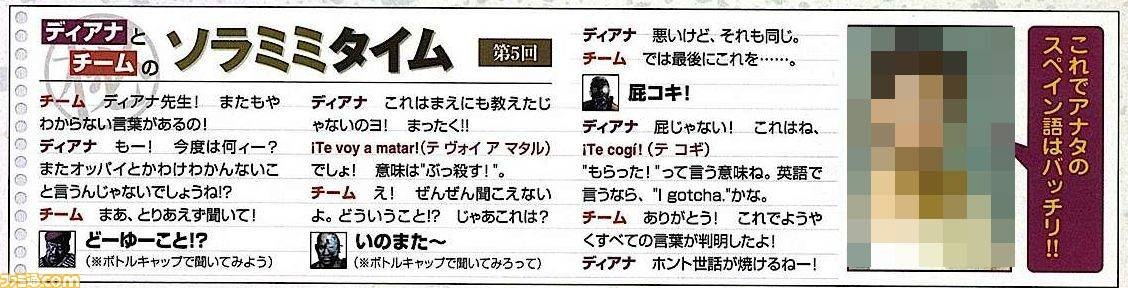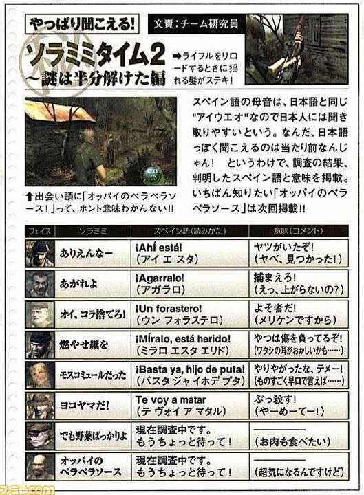 ここでは、ファミ通誌面で紹介された空耳の一部を翻訳とともにまとめてみた。( )内は実際のスペイン語での発音だ。