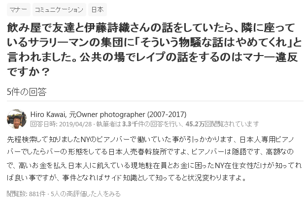 https://jp.quora.com/nomiya-de-tomodachi-to-itou-shi-shoku-san-no-hanashi-wo-shi-tei-tara-tonari-ni-za-tte-iru-sarari-man-no-shuudan-ni-souiu-bussou-na-hanashi-ha-yame-teku-re-to-gen-ware-ma-shita-koukyou-no-ba-de-reipu-no-hanashi-wo