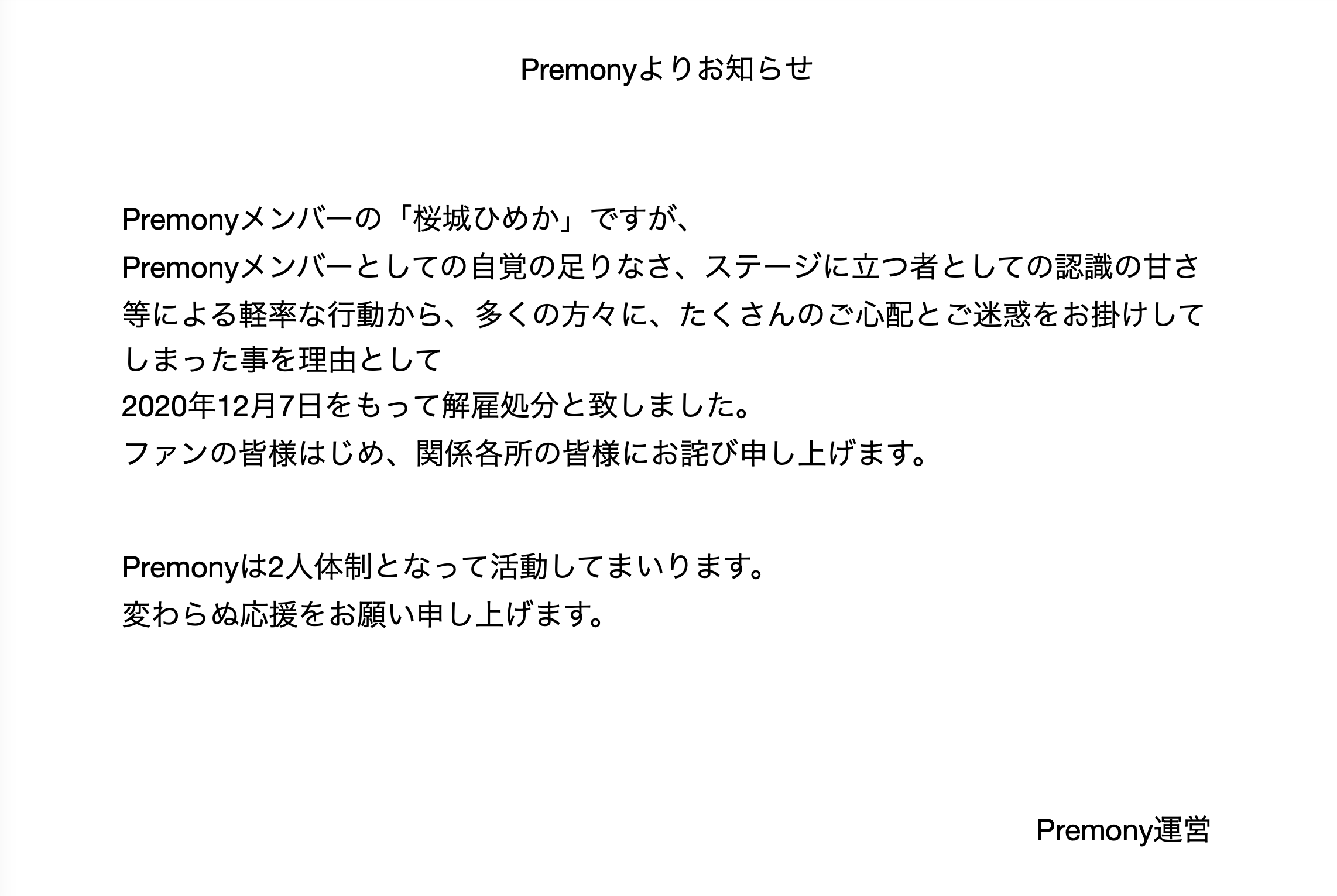 これを受けて運営は桜城ひめかを2020年12月7日付で解雇処分とした。今まで3人だったPremonyは桜城ひめかが抜け2人体制でやっていくことになるという。