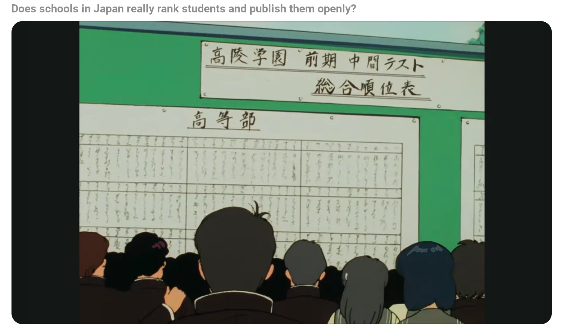 外国人様「日本のアニメを見ると学生のテスト成績が壁一面に貼られてランク付けされてるのですがこの猿の国は正気ですか?」