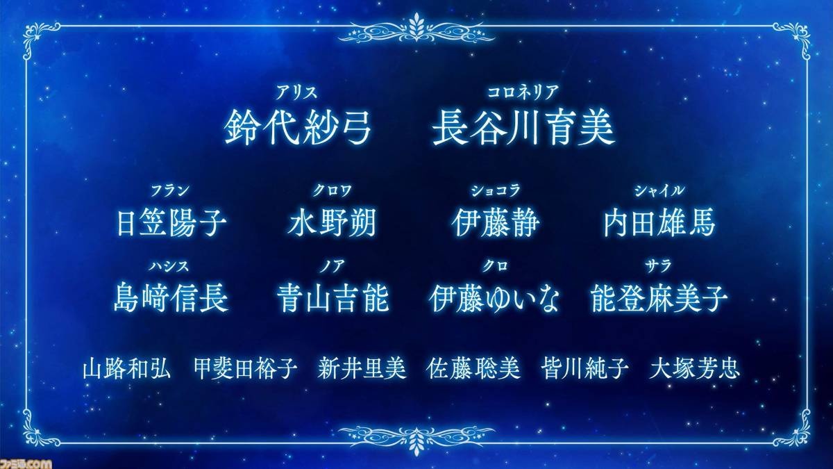 第?報では主?公である「娘(アリス)」役の鈴代紗?さんのみ発表していましたが、今回のトレーラーでは、?王コロネリア役の??川育美さんをはじめ、アリス以外の主要キャラクターたちの声優も公開いたしました。
