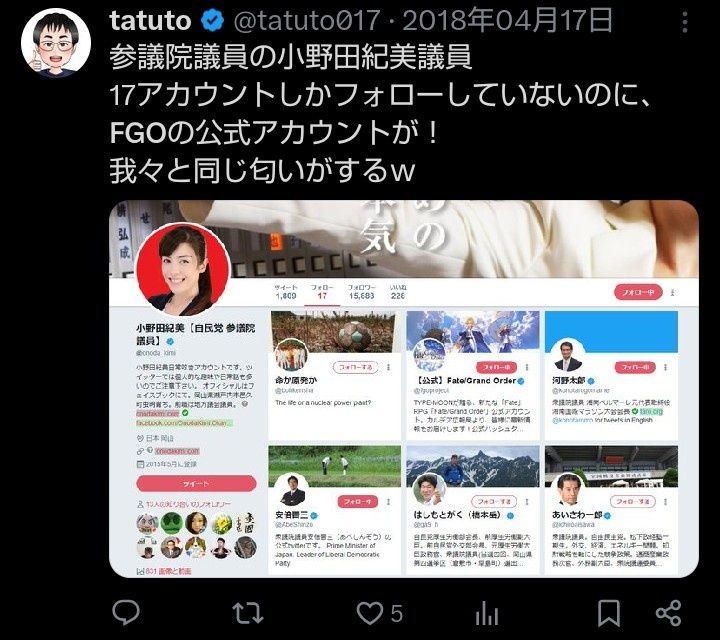 小野田紀美大臣、ソシャゲ『FGO』のヘビーユーザーだったwww