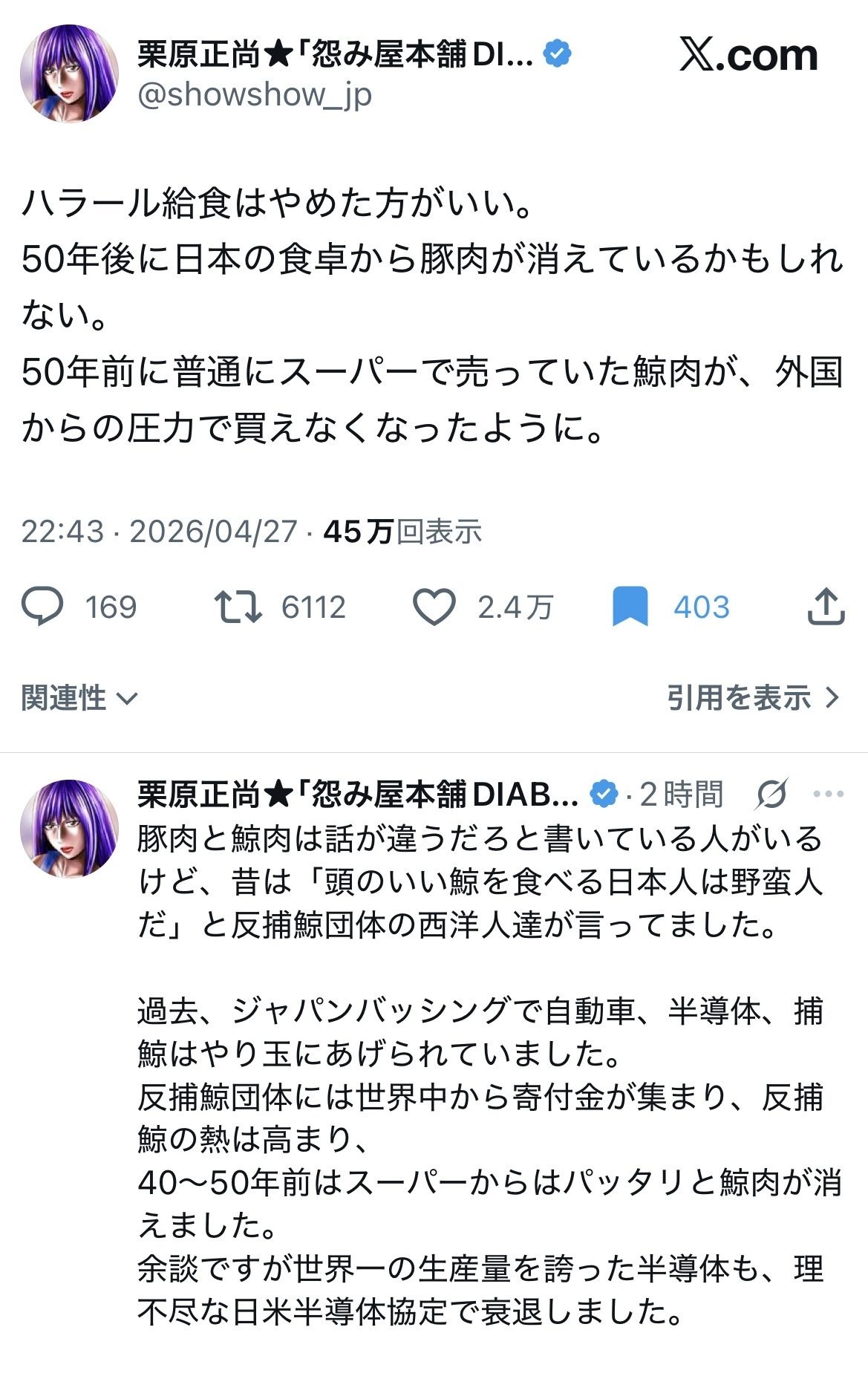 昔はなんで給食に出せるぐらいに鯨肉安かったんだぜ?