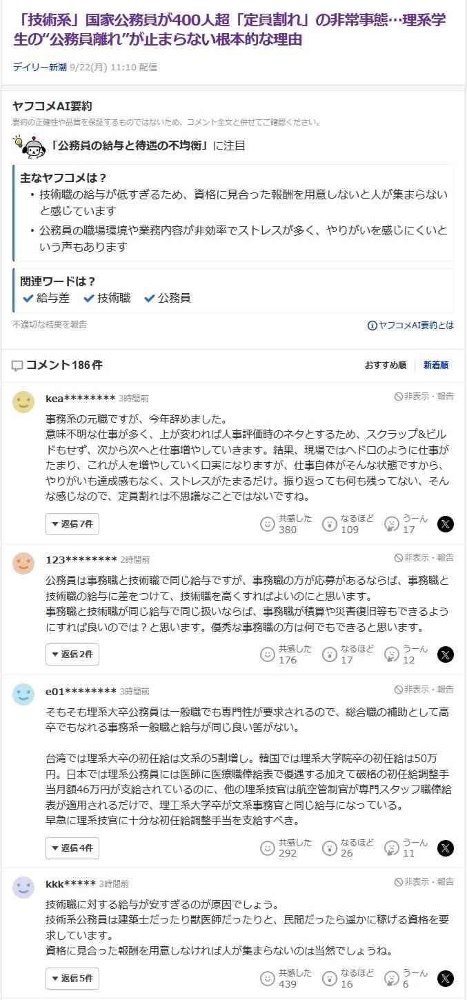 技術系国家公務員が400人以上定員割れ…理系学生「高卒でもなれる文系事務職と給与が同じとかありえない😔」
